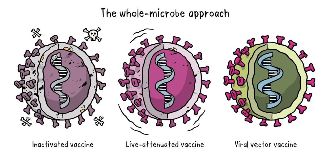 - Cách đầu tiên để tạo ra vaccine là lấy chính các virus hoặc vi khuẩn gây bệnh đã bị bất hoạt bằng cách sử dụng hóa chất, nhiệt hoặc bức xạ. Cách tiếp công nghệ này đã được chứng minh là có hiệu quả và đây là cách sản xuất ra các vaccine cúm và bại liệt, với loại vaccine này có thể được sản xuất ở quy mô hợp lý. Tuy nhiên, đòi hỏi các cơ sở phải có những phòng thí nghiệm đặc biệt để nuôi cấy virus hoặc vi khuẩn một cách an toàn, đòi hỏi thời gian sản xuất tương đối dài và có thể sẽ cần tiêm nhắc lại 2 hoặc 3 liều.